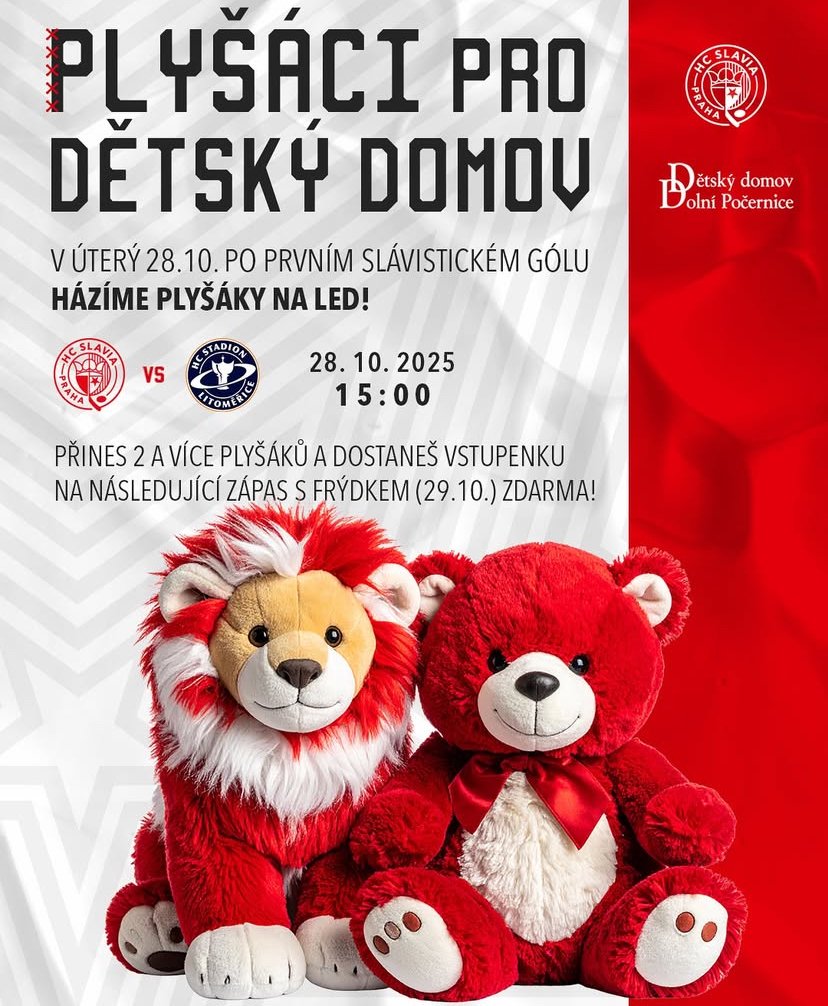 Přineste v úterý 28. října na zápas proti Litoměřicím plyšáky a po prvním slávistickém gólu je naházejte na led. Uděláte tak radost dětskému domovu v Dolních Počernicích, kam je následně předáme. ...