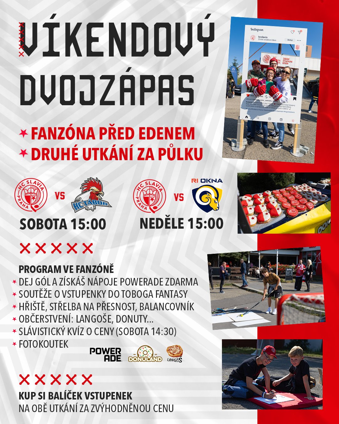 Přijďte si užít slávistický hokejový víkend s fanzónou před stadionem. Na ledě se v sobtou červenobílí střetnou s nováčkem soutěže z Tábora, o den později do Edenu přijede Zlín. Svěřenci Davida Bruka se proti nim pokusí uhájit domácí prostředí a první místo v tabulce Maxa ligy. Na víkend si můžete koupit i speciální balíček vstupenek!